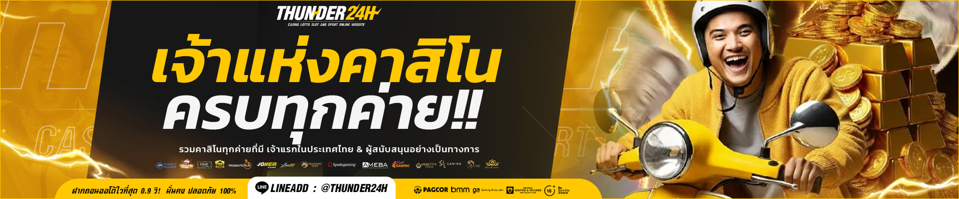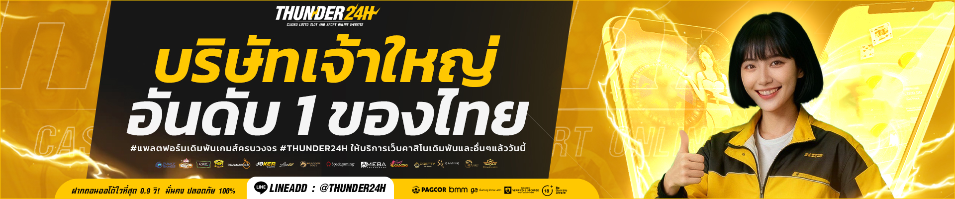ต้องบอกเลยว่า Thunder24h นี่เค้าไม่ธรรมดาจริงๆ ค่ะ เพราะนอกจากจะรวบรวมเกมสล็อตจากค่ายดังระดับโลกอย่าง Pragmatic Play, PG Slot, Joker Gaming แล้ว ยังมีค่ายอื่นๆ อีกเพียบที่คัดสรรมาให้เราได้เลือกเล่นกันแบบจุใจ ไม่ว่าจะเป็น Spadegaming, Habanero หรือแม้แต่ค่ายใหม่ๆ ที่กำลังมาแรงก็มีให้เราได้ลองกันหมด